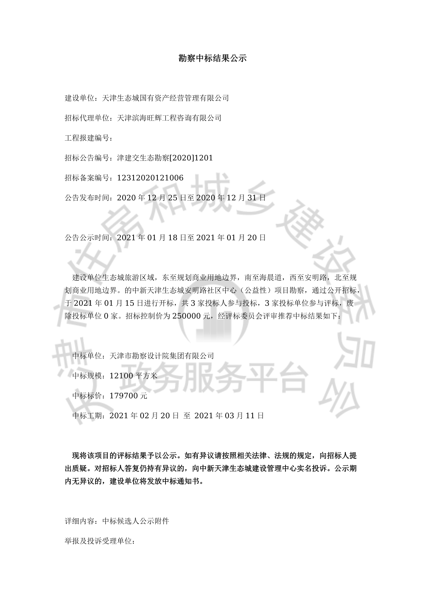 中新天津生态城安明路社区中心(公益性)项目勘察中标公示