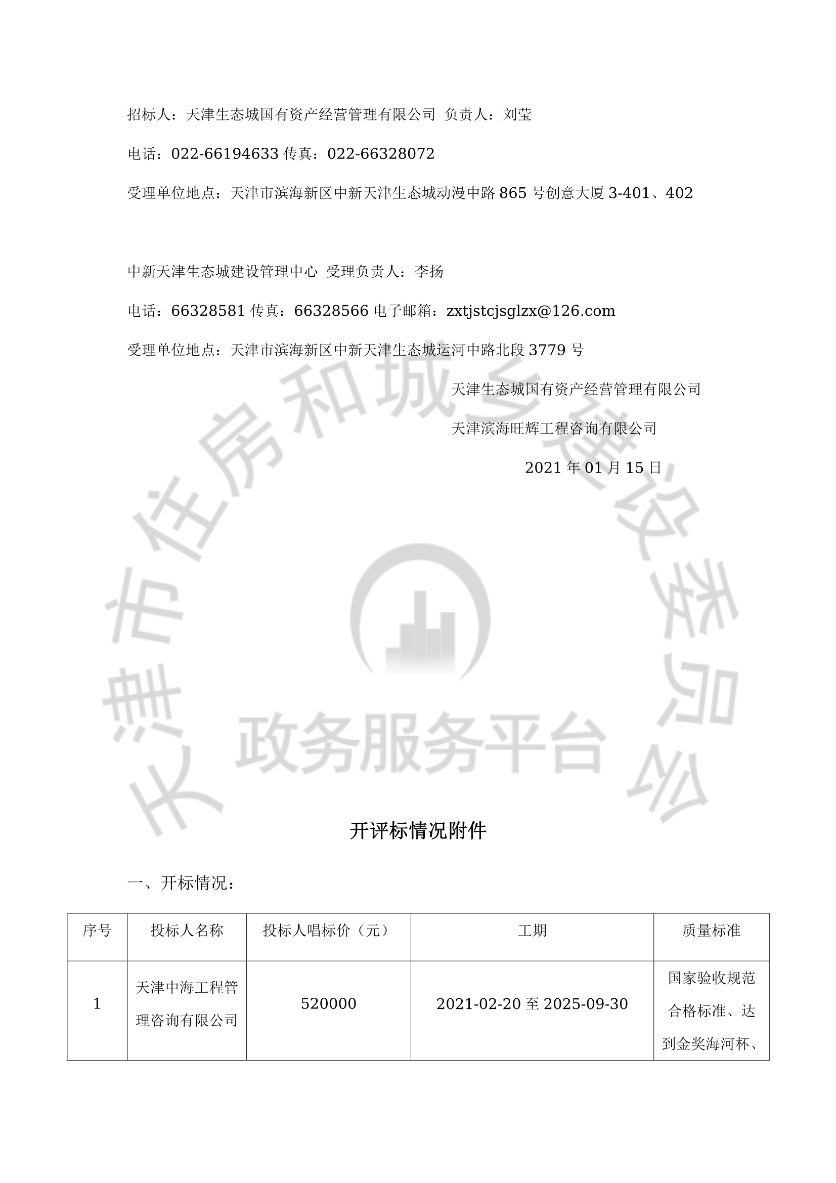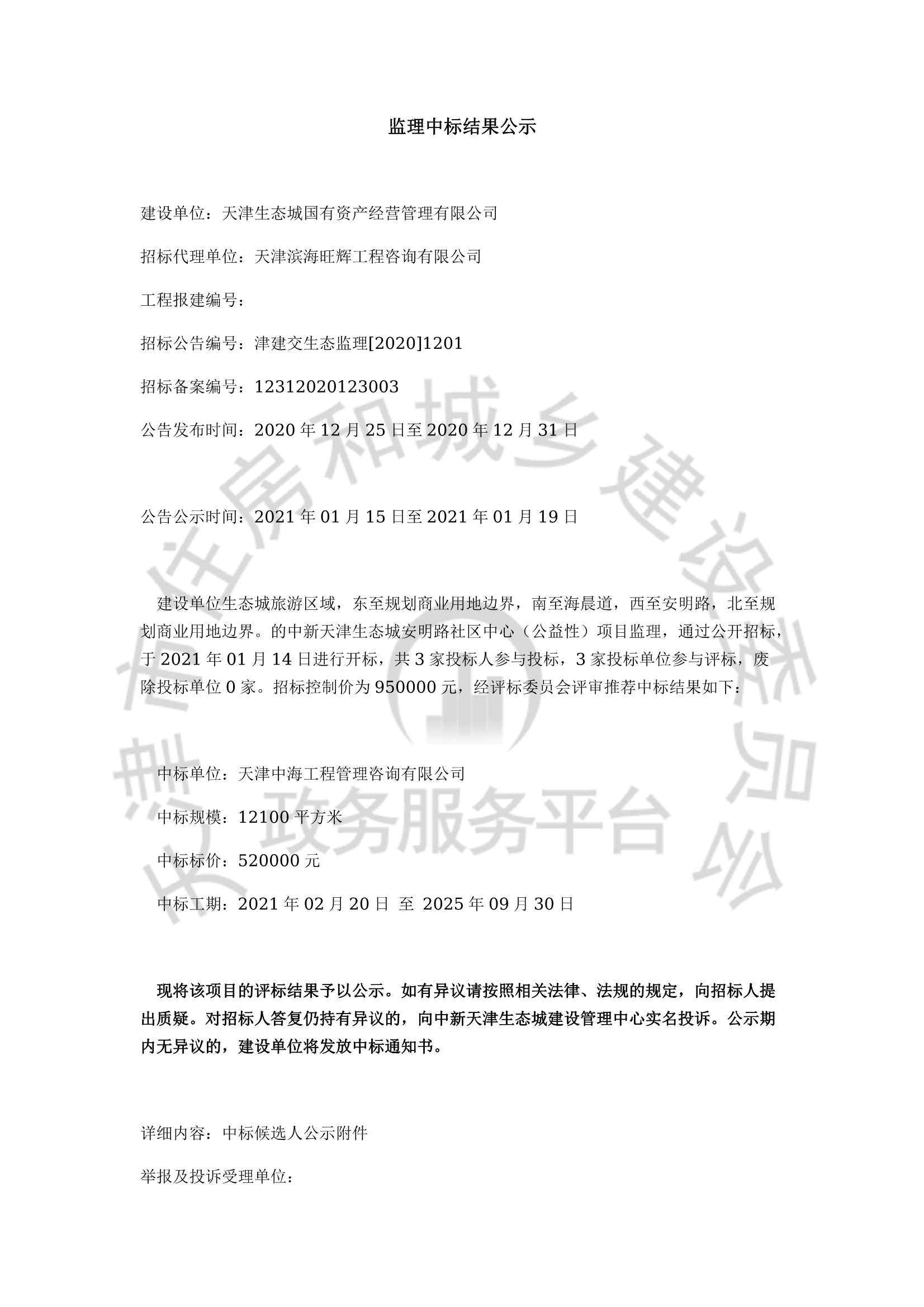 中新天津生态城安明路社区中心(公益性)项目监理中标公示
