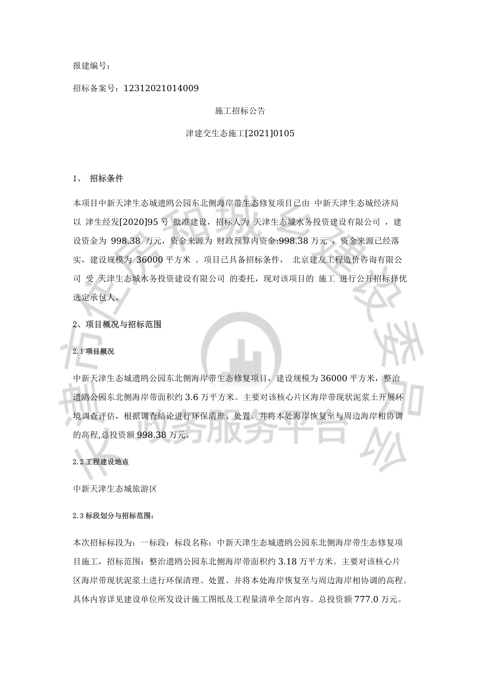 中新天津生态城遗鸥公园东北侧海岸带生态修复项目施工招标公告
