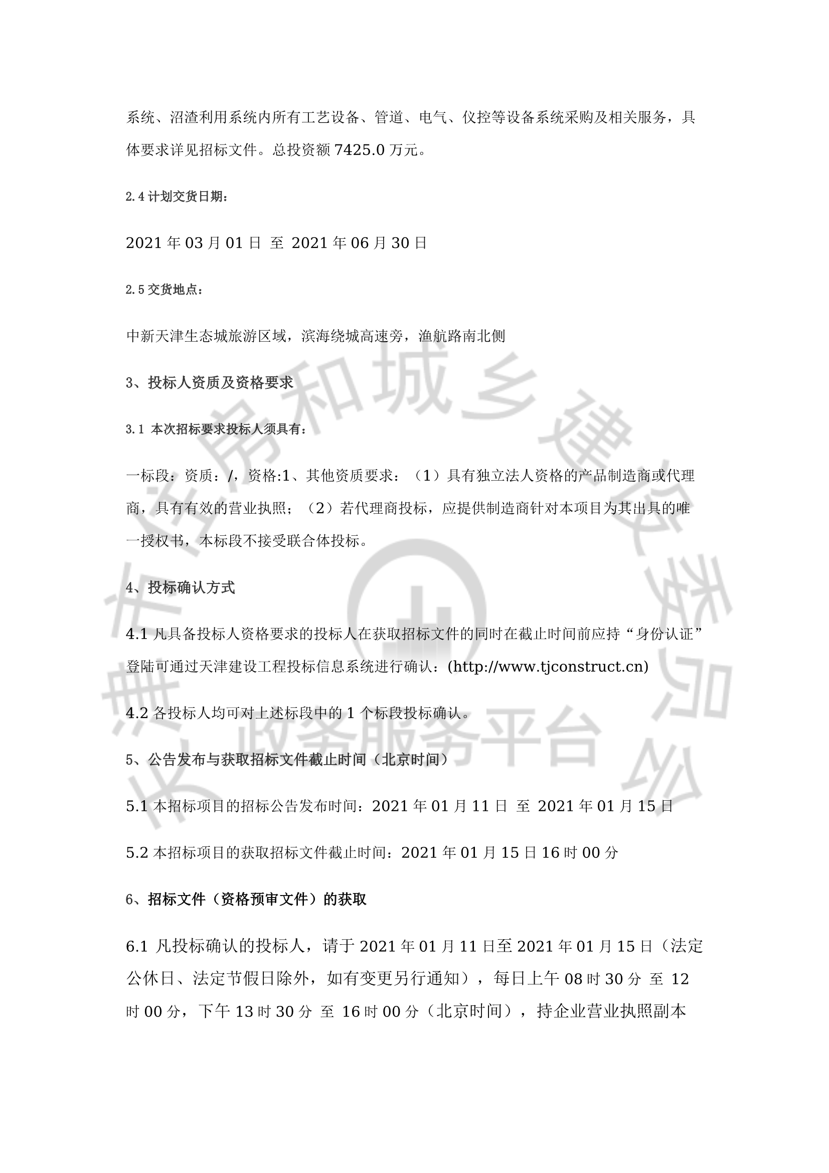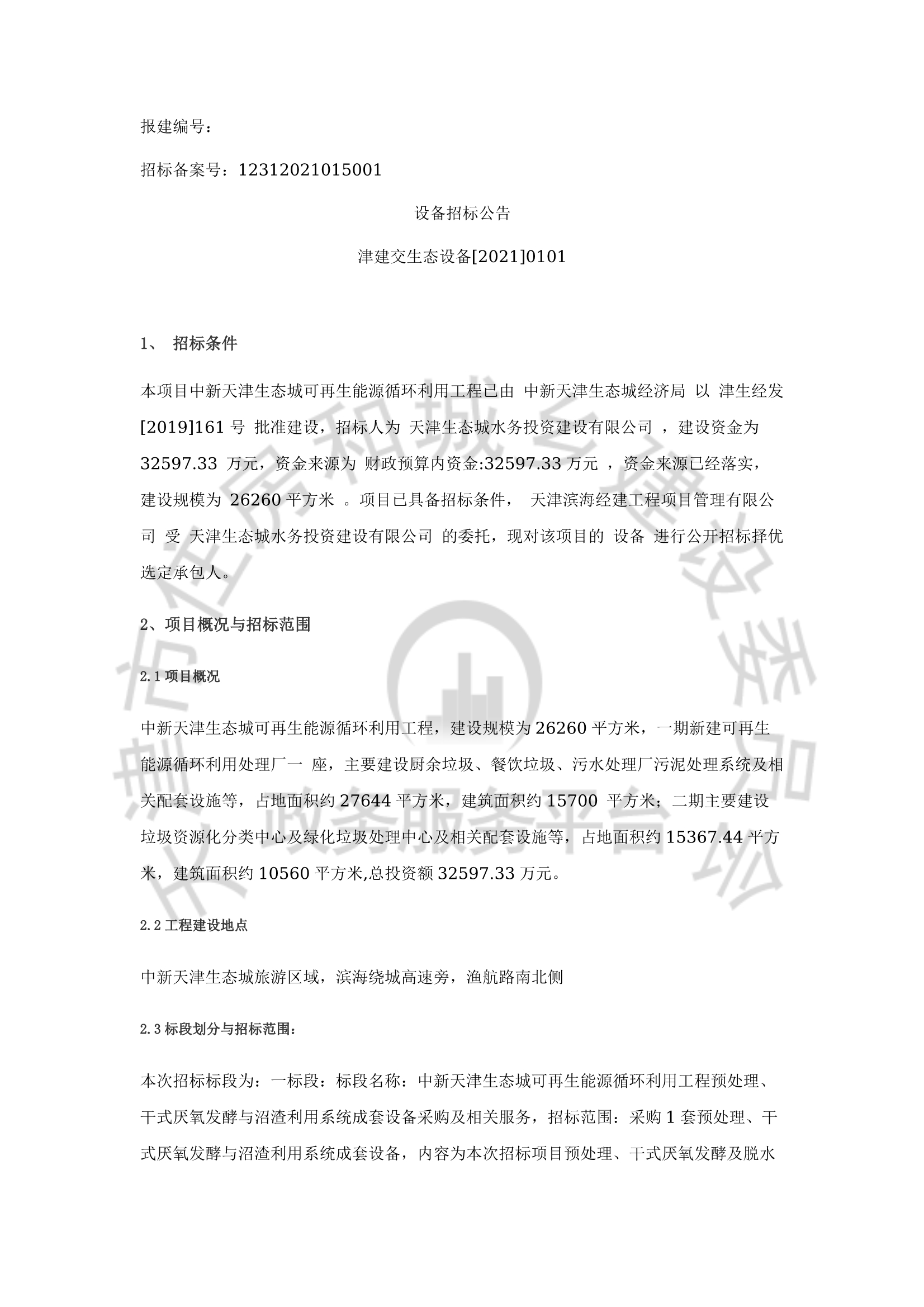 中新天津生态城可再生能源循环利用工程预处理、干式厌氧发酵与沼渣利用系统成套设备采购及相关服务招标公告