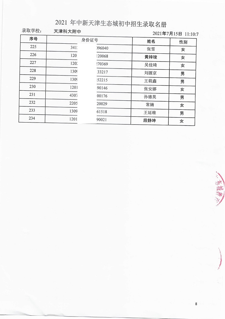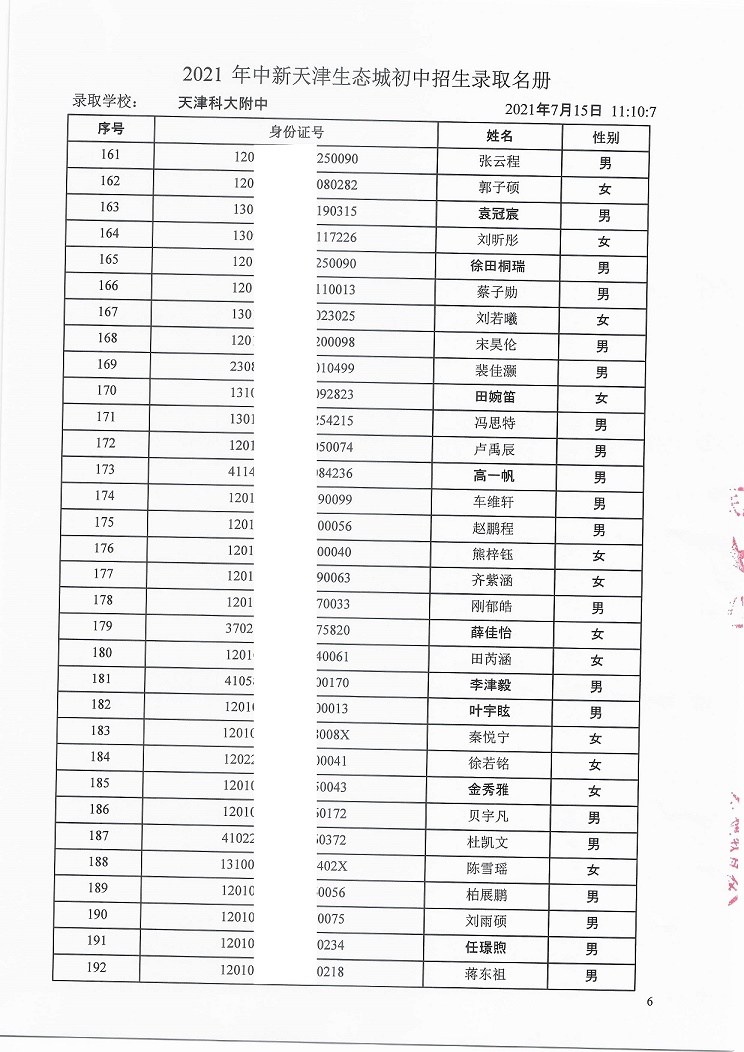 天津科技大学附属中学7年级录取名单
