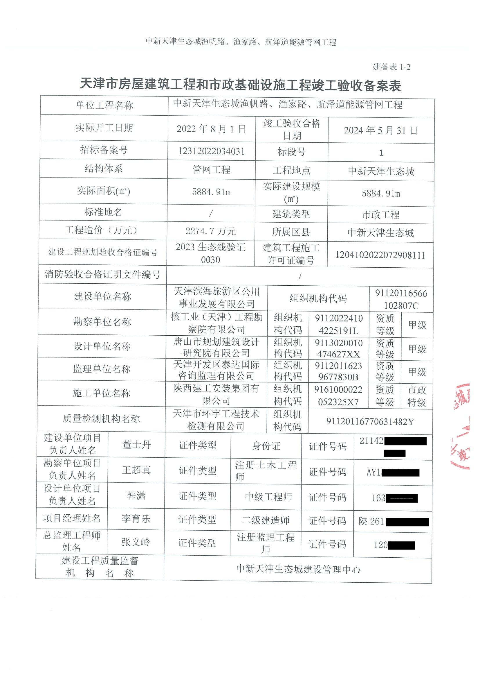 中新天津生态城渔帆路、渔家路、航泽道能源管网工程竣工备案公布